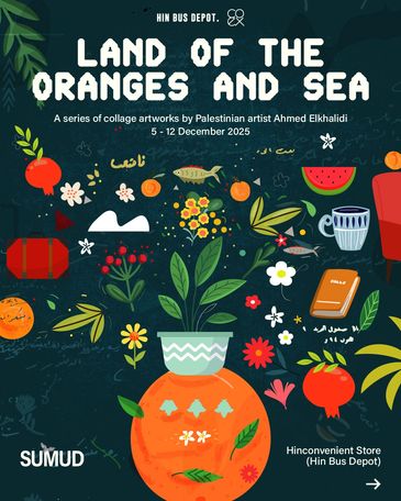 𝙇𝙖𝙣𝙙 𝙤𝙛 𝙏𝙝𝙚 𝙊𝙧𝙖𝙣𝙜𝙚𝙨 𝙖𝙣𝙙 𝙎𝙚𝙖 by Ahmed Elkhalidi, featuring 17 mixed media artworks inspired by Yafa (Jaffa), the Mediterranean, and his family’s orchard. This exhibition brings together heritage and contemporary reflection, telling stories of hope, grief, and belonging through art.