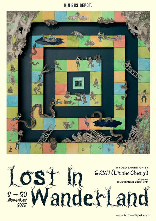 In Lost in Wanderland, ERYN mobilises the formal logic of Snakes and Ladders as a working schema for mapping affective trajectories. Her papercut compositions, ranging from intricate single layered cutouts to multi-layered dioramas, reimagines the gameboard as an endless cycle of ascents and descents, without ever reaching a conclusion. The grid constructs a procedural architecture, reframing the traditional two-dimensional gameboard into a spatial construct, reduced to fragments or expanded into corridors and stairways drawn from the architecture of Penang. Within this configuration, ladders no longer guarantee ascent, nor do serpents signify descent; both become ambivalent passages through which the artist maps shifting states of mind, each composition recording a moment of passage, pause, or return.